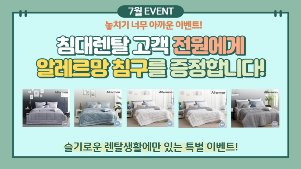 창녕매트리스렌탈을 신청해주시는 모든 고객님들께 저희가 준비한 선물 알레르망침구세트를 증정합니다.