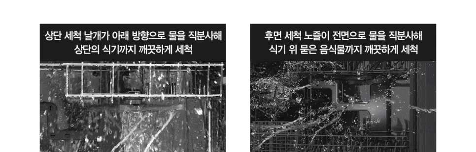 뜨거운 물을 직분사하여 식기를 세척함으로 눈에 보이지 않는