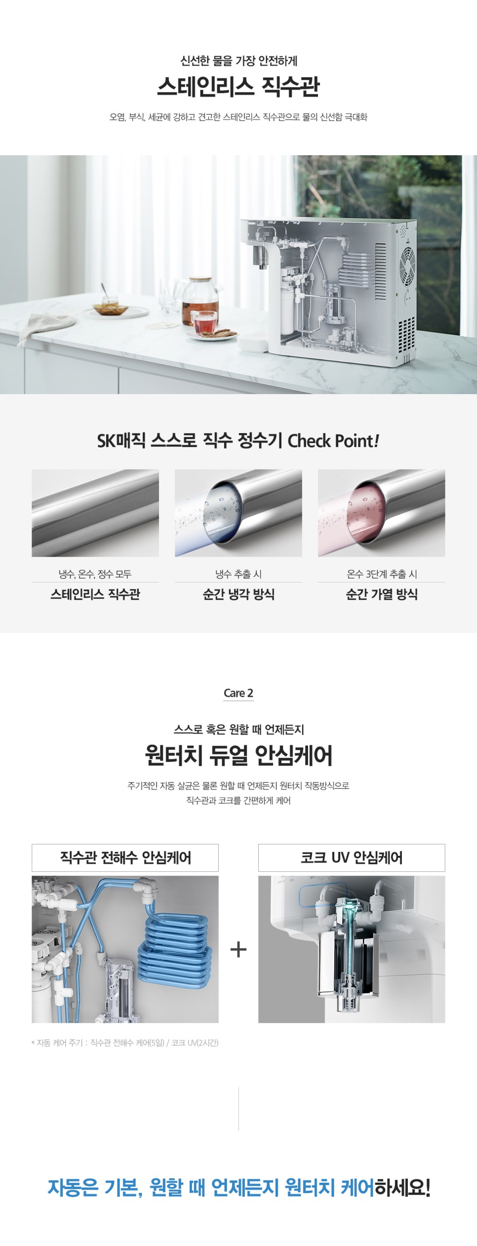 직수관 전해수 안심케어와 코크 UV 안심케어로 더욱더 안심하고 안전하게