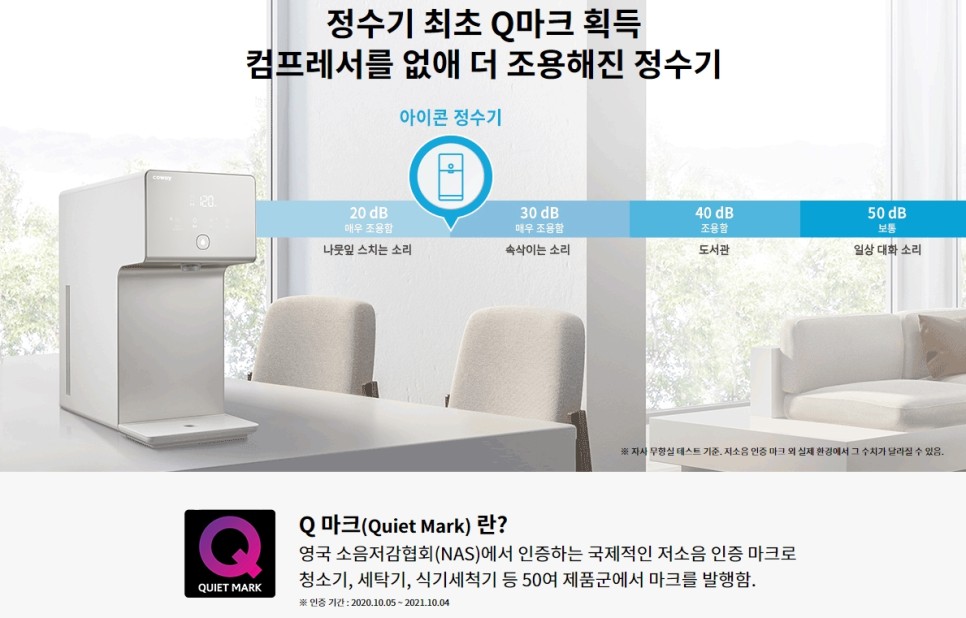소음 부분인데요. 아이콘 정수기는 더 조용한 일상생활이 될 수 있도록