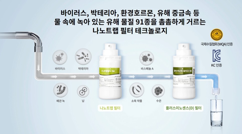 코웨이의 필터로 물 속에 녹아있는 각종 유해물질 91종을 거른