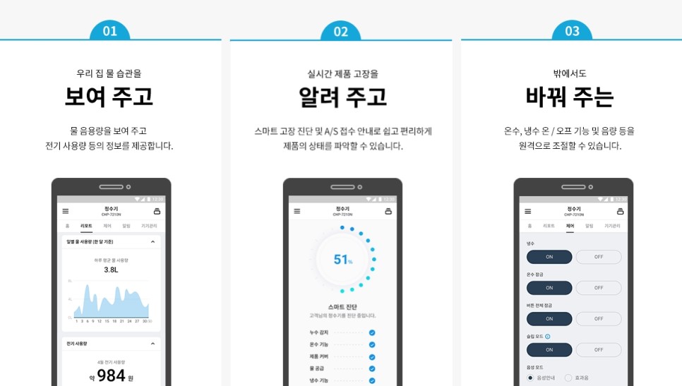 핸드폰을 통해서 정수기 상태를 파악할 수 있는데요!