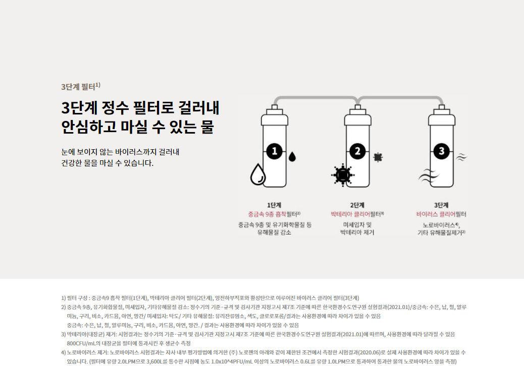 3개의 필터로 물 안에 보이지 않는 바이러스,유해물질들을 걸러내어