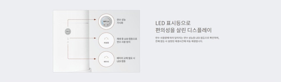 퀄리티 높은 코웨이 연수기인데요. 이용자에게 믿음을 줄수 있게끔 연수기의 연수 성능을 직접 눈으로 확인할수 있게끔 LED 표시등이 적용이 되어있는데요.