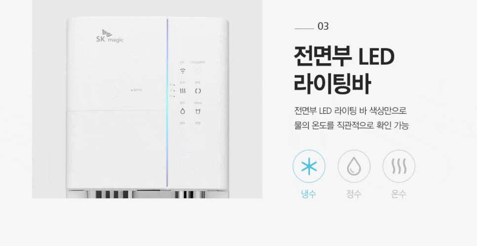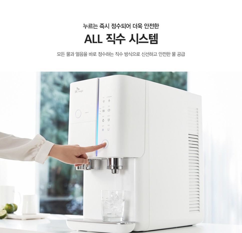 SK매직 얼음정수기는 냉수,온수,정수를 직수로